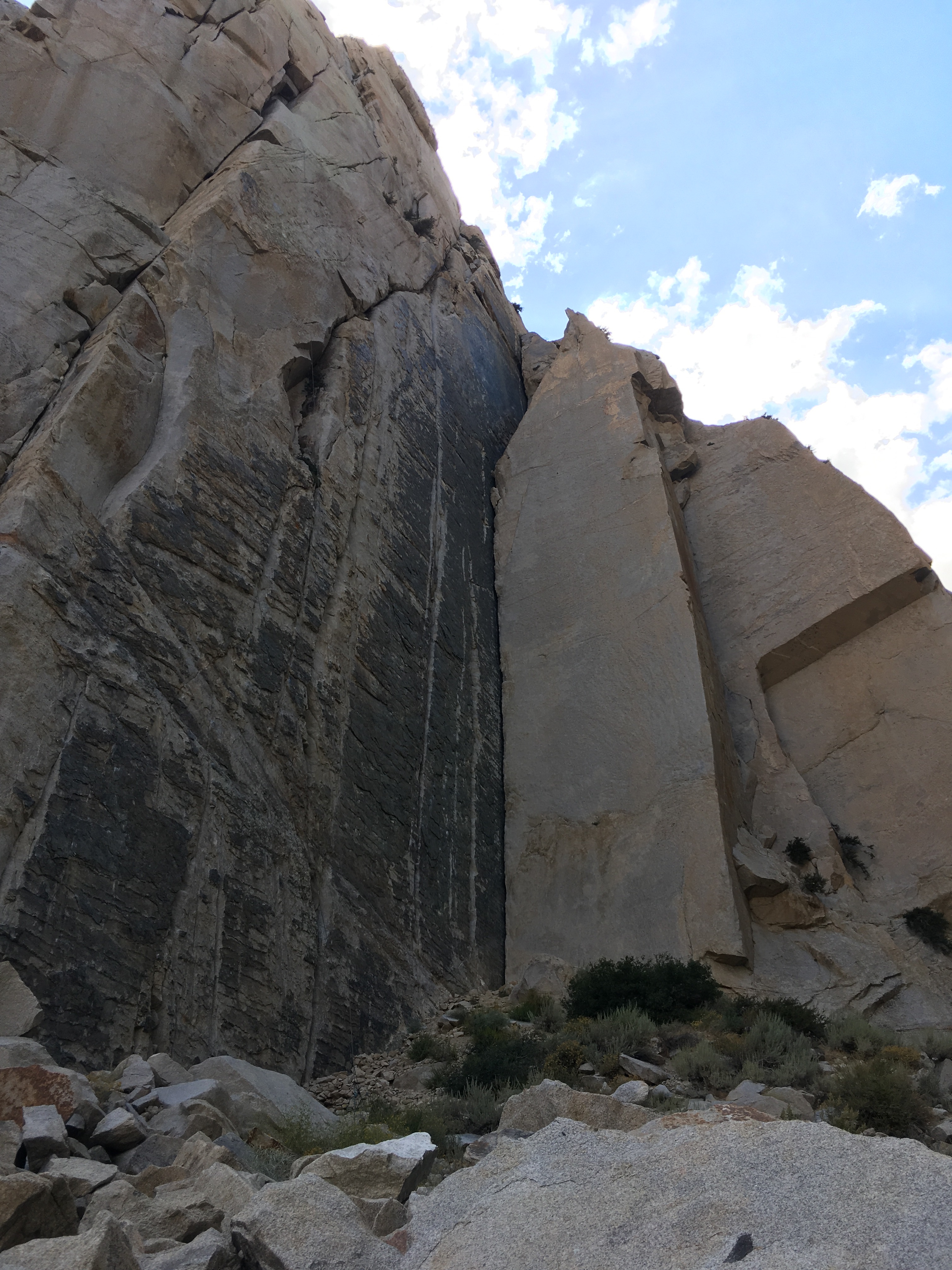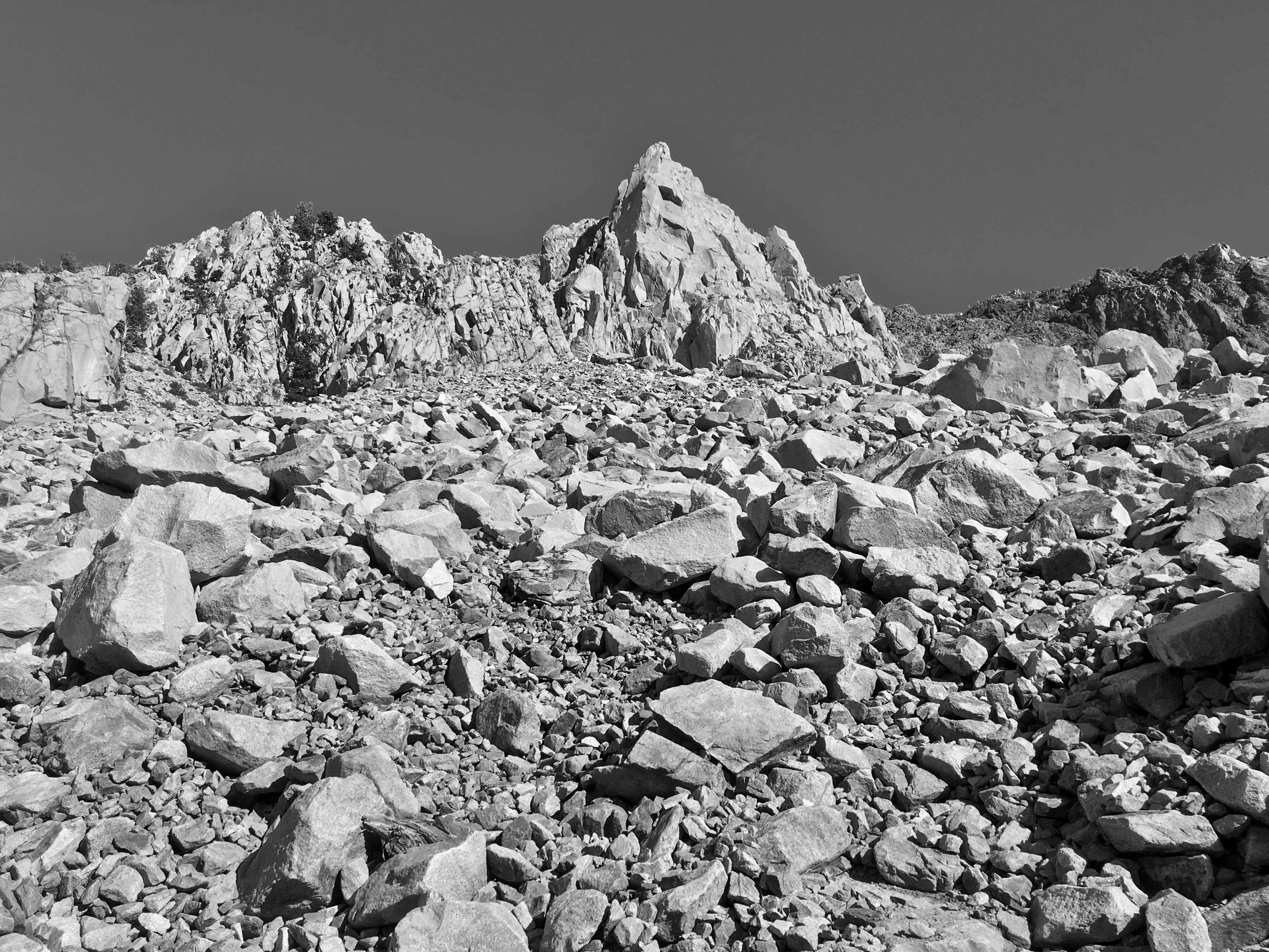 Nate picked a 4-pitch trad route on Cardinal Peak, rated 5.10a. The ascent towards the crag, a talus field full of wobbly boulders, was already demanding.