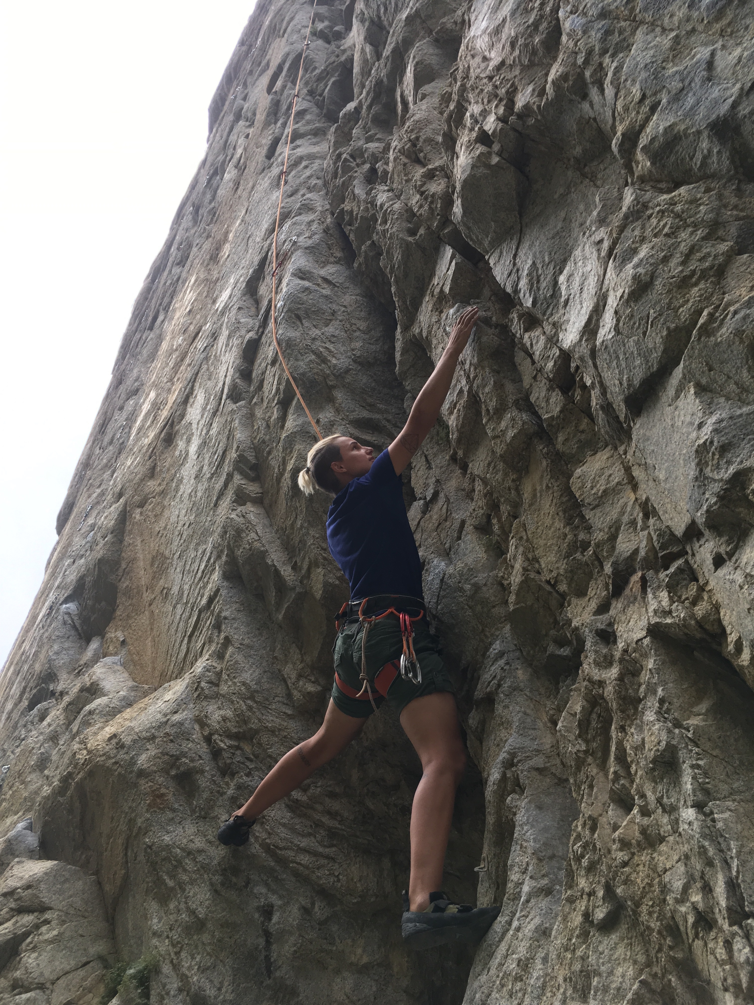 When I took over the third pitch, the sun was beaming on the very smooth surface, but I managed to get up without much of a problem. While laybacking with my fingertips in a tiny crack and my tip-less shoes crammed into the tiniest openings of the crack, I felt absolutely thrilled and joked that my new name is Finn Hill 🤪 Then it happened: after placing a solid cam, I kind of slipped and slowly glid down the rock surface towards the cam. Not a friend of taking falls (Hello Saxony!) I dug my fingers into the crack and stood up again, remarkably calm. The rest of the route flew by and I built an anchor with nuts and cams – a more difficult task!